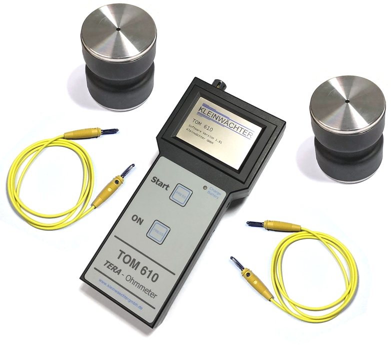 表面电阻/体积电阻:使用双面重锤电极,将电极同心圆面朝下放置,连接白色和黑色插孔至测试仪。